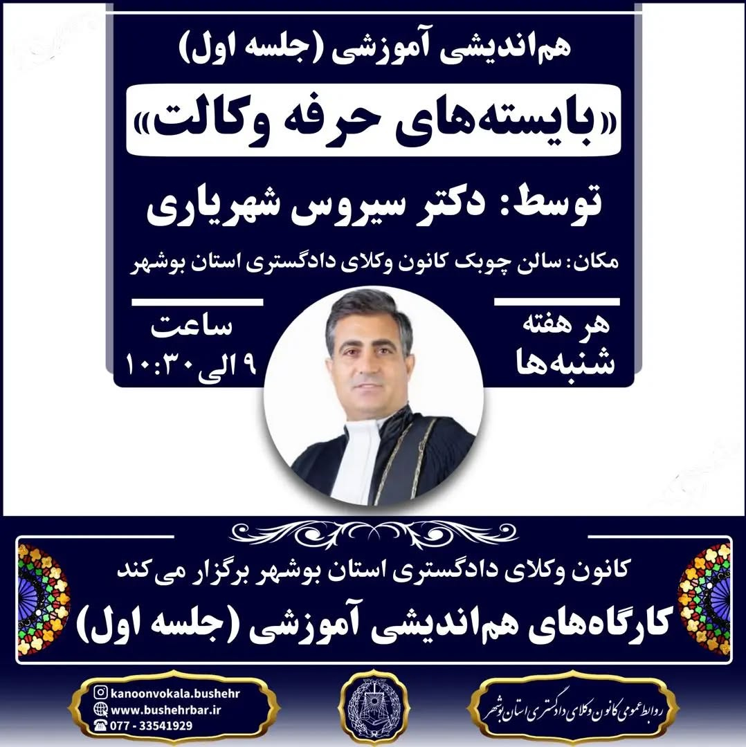 مرکز آموزش عالی علمی کاربردی وکلای دادگستری مرکز با همکاری کانون وکلای دادگستری استان بوشهر برگزار میکند: