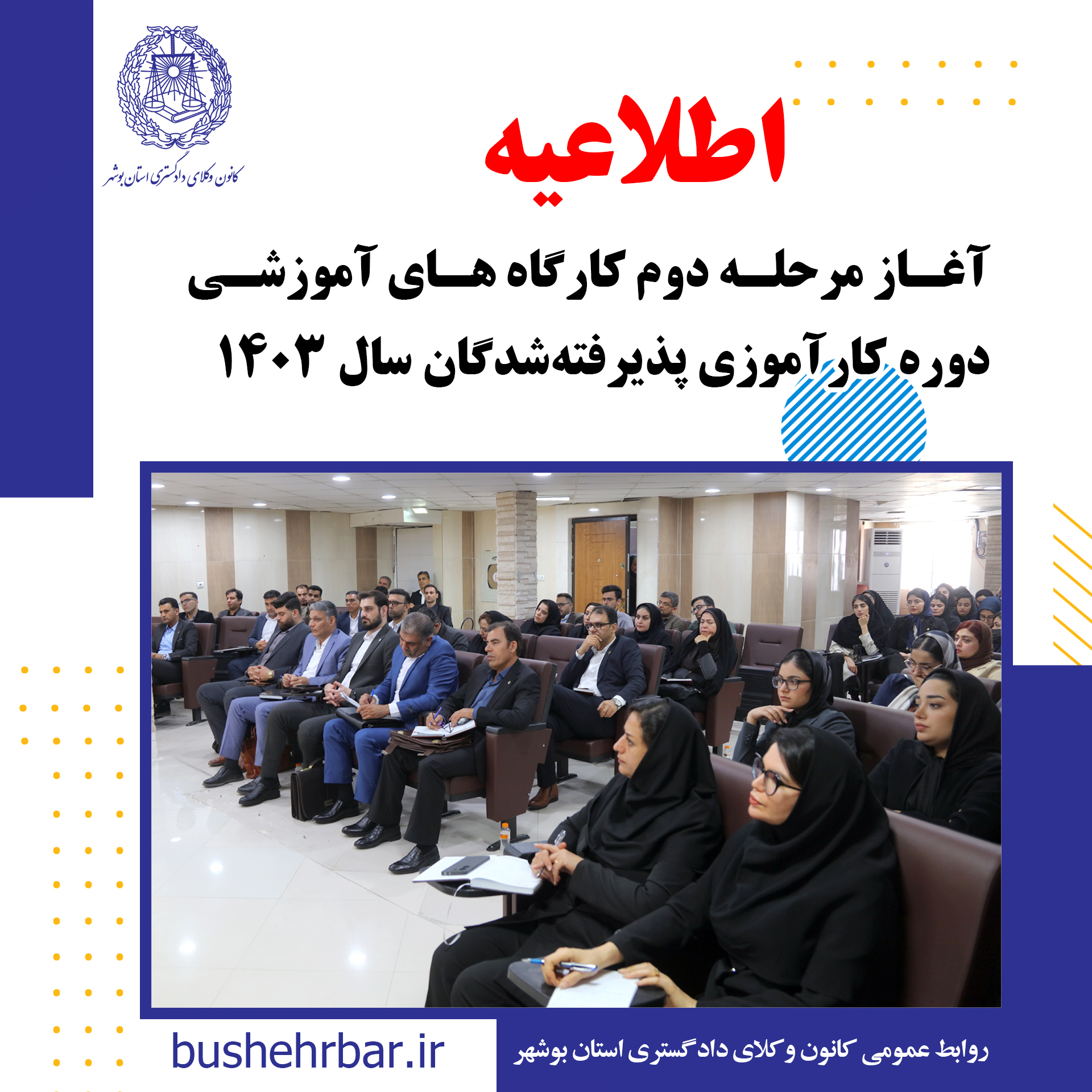 بر اساس تکلیف مقرر در بند (پ) از قسمت دوم ماده ۵۴ آییننامه لایحه قانونی استقلال کانون وکلا، اجرای بخشی از برنامههای مرحله دوم دوره کارآموزی پذیرفتهشدگان سال ۱۴۰۳ از تاریخ ۱۴۰۴/۰۷/۱۷ آغاز میگردد.