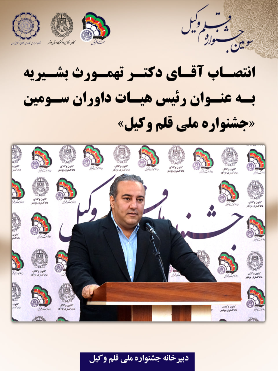 به موجب حکمی از سوی رئیس کانون وکلای دادگستری استان بوشهر،دکتر تهمورث بشیریه