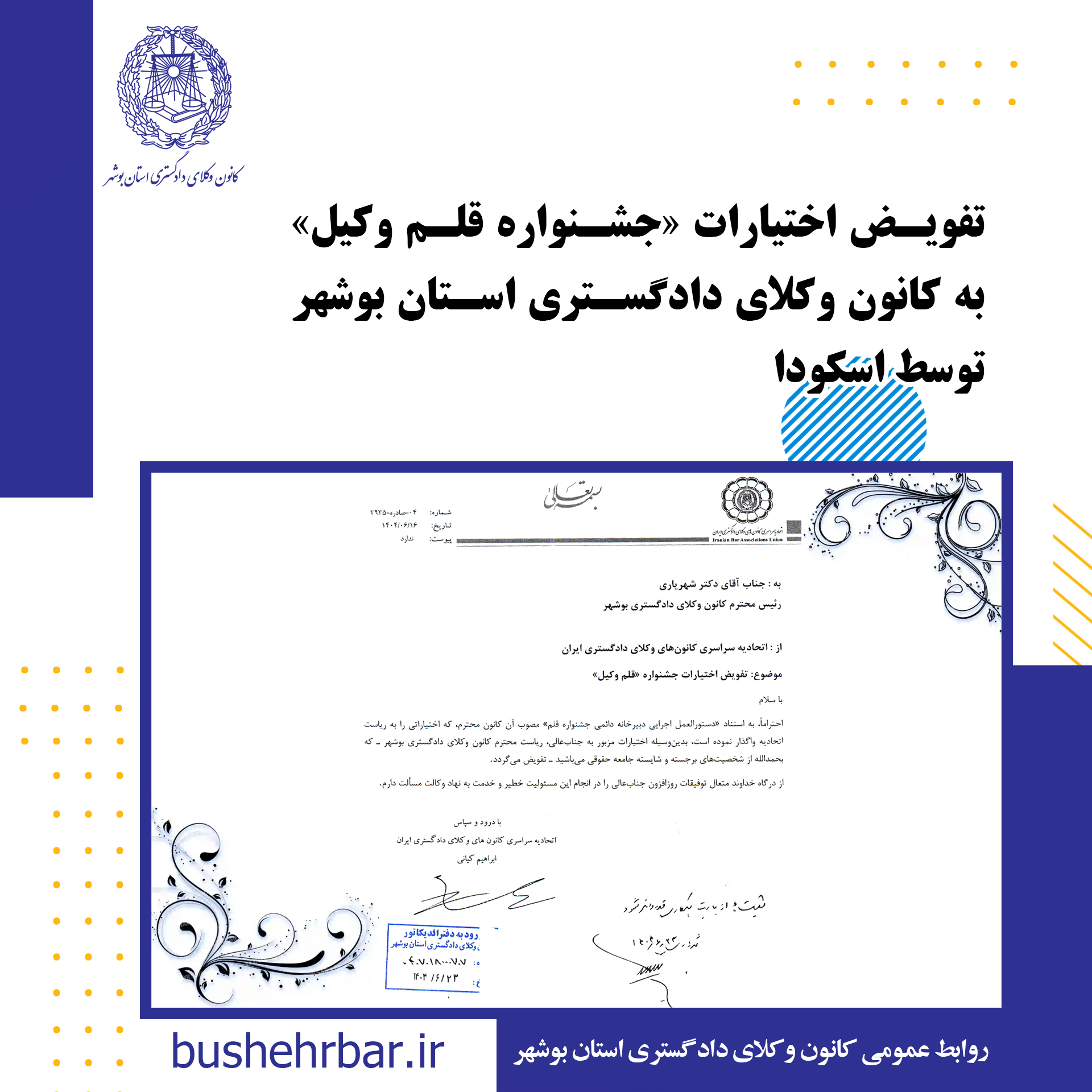 کانون وکلای دادگستری بوشهر، مراتب سپاس و امتنان خود را از حسن اعتماد ارزشمند اتحادیه سراسری کانونهای وکلای دادگستری ایران بهویژه جناب آقای دکتر ابراهیم کیانی، سرپرست محترم اتحادیه، اعلام میدارد.