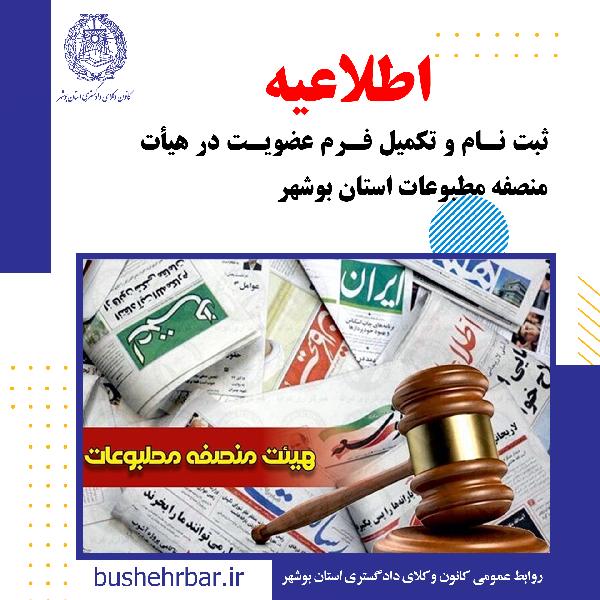 اطلاعیه ثبت نام و تکمیل فرم عضویت در هیأت منصفه مطبوعات استان بوشهر