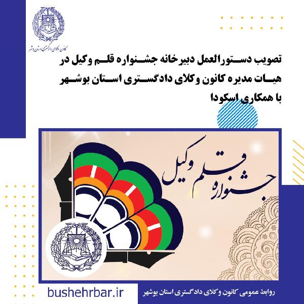 تصویب دستورالعمل دبیرخانه جشنواره قلم وکیل در هئات مدیره کانون وکلای دادگستری استان بوشهر با همکاری اسکودا