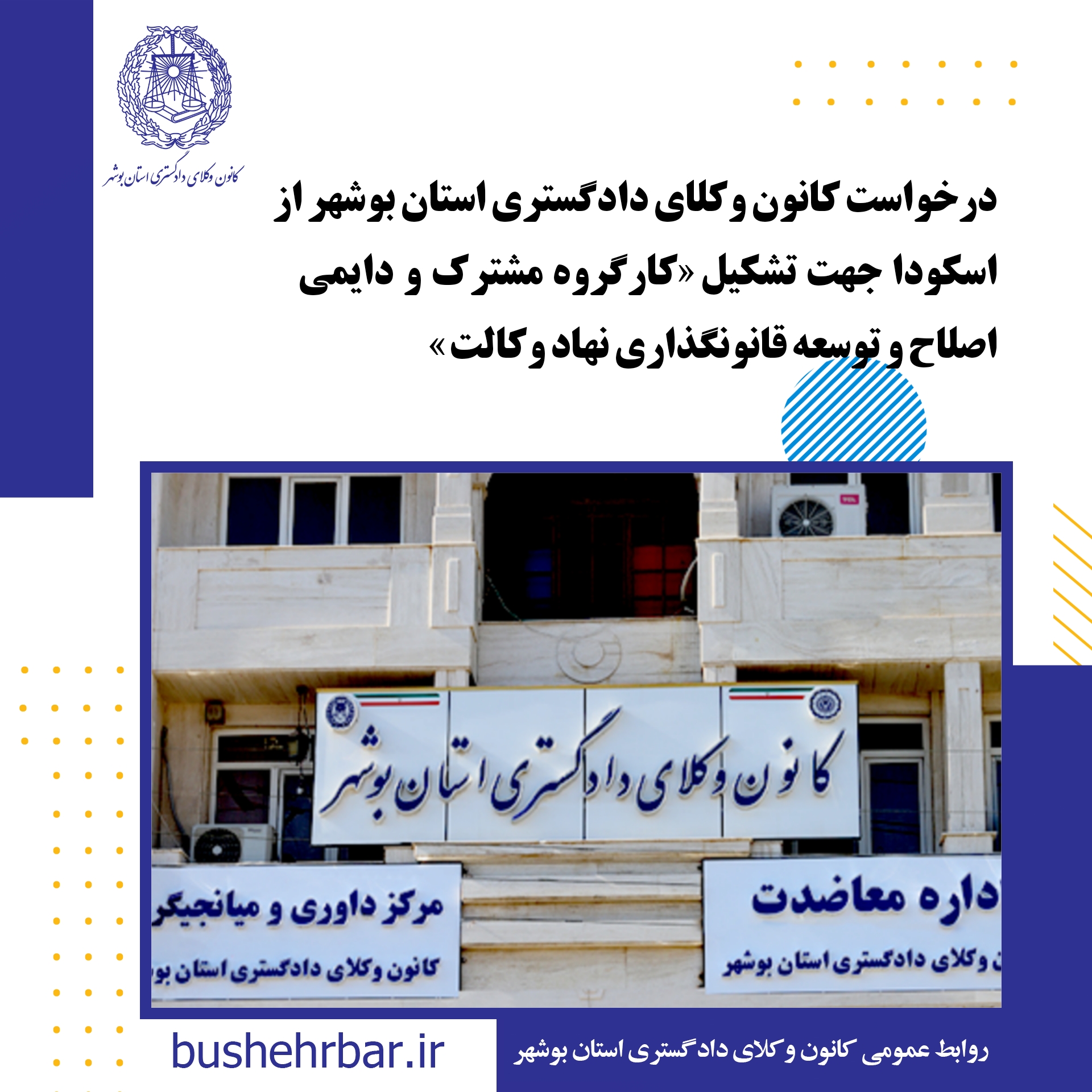 کانون وکلای دادگستری استان بوشهر طی نامهای رسمی به به شرح فوق از اتحادیه سراسری کانونهای وکلای دادگستری ایران (اسکودا)، درخواست تشکیل «کارگروه مشترک و دائمی اصلاح و توسعه قانونگذاری نهاد وکالت» را ارائه نمود. هدف از این کارگروه، رصد مستمر طرحها و لوایح مرتبط با حرفه وکالت، بررسی نیازهای اصلاحی، و ارائه پیشنهادات کارشناسی جهت ارتقای جایگاه نهاد وکالت در فرآیند قانونگذاری کشور عنوان شده است.