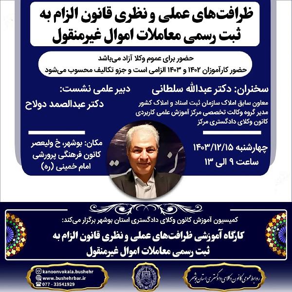کارگاه آموزشی ظرافتهای عملی و نظری قانون الزام به ثبت رسمی معاملات اموال غیرمنقول سخنران: دکتر عبدالله سلطانی معاون سابق املاک سازمان ثبت اسناد و املاک کشور مدیر گروه وکالت تخصصی مرکز آموزش علمی کاربردی کانون وکلای دادگستری مرکز دبیر نشست: دکتر عبدالصمد دولاح زمان : ۱۴۰۳/۱۲/۱۵ ساعت ۹ الی ۱۳ مکان: بوشهر ، خیابان ولیعصر ، کانون فرهنگی پرورشی امام خمینی (ره)