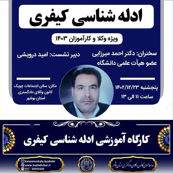 کارگاه آموزشی ادله شناسی کیفری سخنران: دکتر احمد میرزایی عضو هیأت علمی دانشگاه دبیر نشست: امید درویشی زمان: پنجشنبه ۱۴۰۳/۱۲/۲۳ ساعت ۱۱ الی ۱۳ مکان: سالن اجتماعات چوبک کانون وکلای دادگستری استان بوشهر