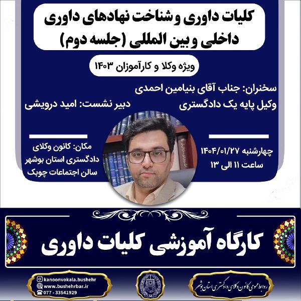 موضوع: کلیات داوری و شناخت نهادهای داوری داخلی و بین المللی (جلسه دوم) سخنران: جناب آقای بنیامین احمدی وکیل پایه یک دادگستری دبیر نشست: امید درویشی زمان: چهارشنبه ۱۴۰۴/۰۱/۲۷ ساعت ۱۱ الی ۱۳ مکان: کانون وکلای دادگستری استان بوشهر، سالن اجتماعات چوبک