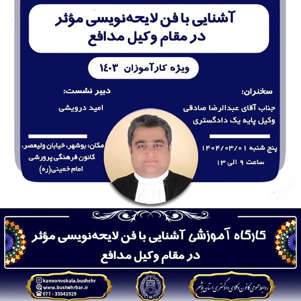 کارگاه آموزشی آشنایی با فن لایحهنویسی مؤثر در مقام وکیل مدافع سخنران: جناب آقای عبدالرضا صادقی وکیل پایه یک دادگستری دبیر نشست: امید درویشی زمان: پنج شنبه ۱۴۰۴/۰۳/۰۱ ساعت ۹ الی ۱۳ مکان: بوشهر، خیابان ولیعصر، کانون فرهنگی پرورشی امام خمینی(ره)