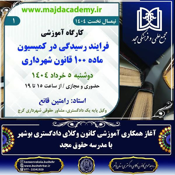 در پی تفاهمنامه همکاری علمی و آموزشی میان کانون وکلای دادگستری استان بوشهر و مؤسسه آموزش عالی آزاد مجد، امکان بهرهمندی از ۱۶ کارگاه تخصصی در نیمسال نخست سال جاری برای وکلا و علاقمندان حقوق فراهم شده است. این کارگاهها با تدریس اساتید برجسته و بهصورت حضوری در سالن همایش مجد و همچنین آنلاین از طریق سامانه وبینار پلاس برگزار خواهد شد.