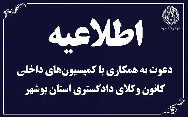 اطلاعیه دعوت به همکاری با کمیسیونهای داخلی کانون وکلای دادگستری استان بوشهر